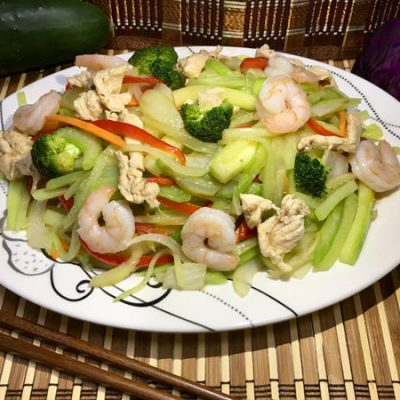 verdura cocida, pollo desmenuzado y camarones, para 2-3 personas