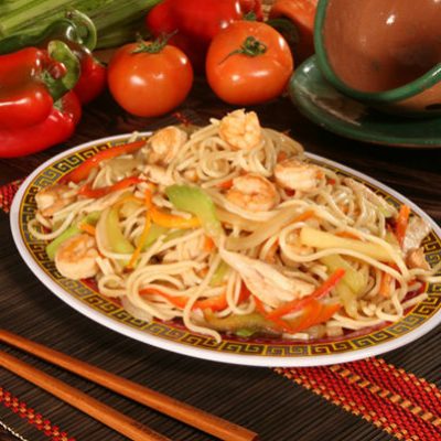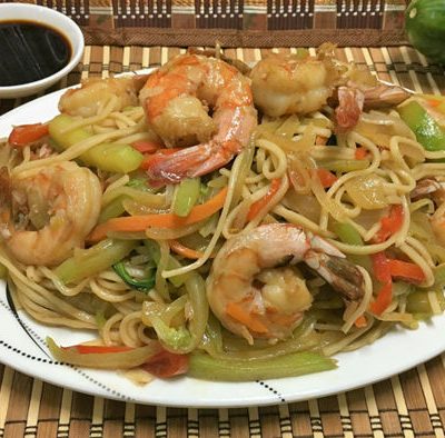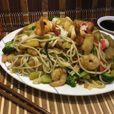 Especialidad de la casa – verdura cocida con pasta, langostinos, calamar, camarones, pescado,