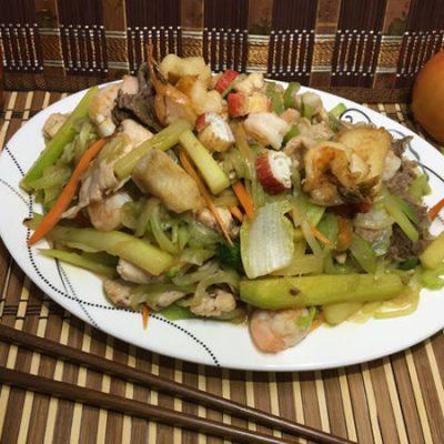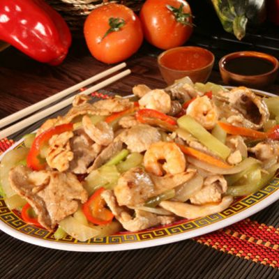 Especialidad de la casa – langostinos, calamar, camarones, pescado, carne de cerdo, carne