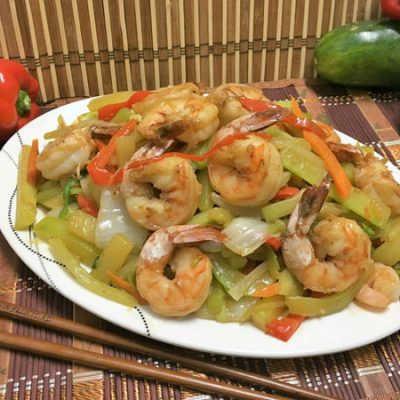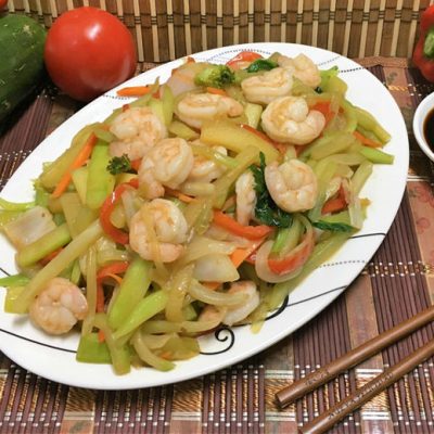 verdura cocida, camarones, pollo desmenuzado, carne de cerdo, para 2-3 personas